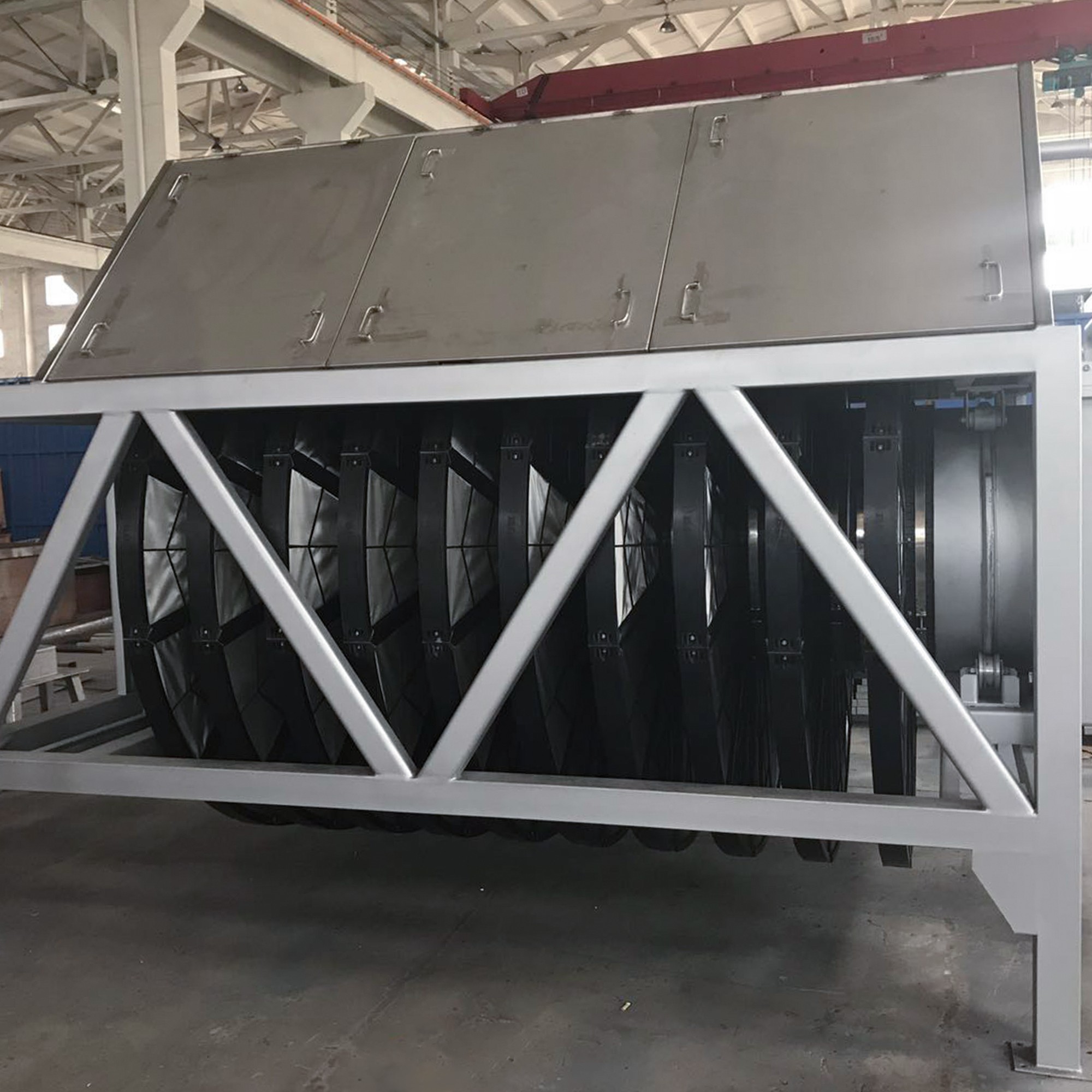 濾布濾池:該系統(tǒng)包括混泥土池體、進水堰箱、出水可調堰板、支撐軸座、中空設備主體(等邊六角形或者圓形)、纖維濾盤、支撐滑輪、出水口密封組件、排污系統(tǒng)、驅動裝置、自動化控制系統(tǒng)。設備主體端部與支撐軸座法蘭連接,出水管置于支撐滑輪上,并安裝出水密封組件;纖維濾盤垂直安裝在設備主體上;濾盤內部設有骨架,用于支撐包裹在外面的濾布,骨架中空,并與設備主體連接固定后形成一個外部密封,內部中空的整體;排污系統(tǒng)包括池底排污和濾盤反洗,每個濾盤的兩側設有反抽吸裝置。運行時,污水經過進水堰箱,均勻進入濾池,由外向內通過濾盤,由濾盤上的濾布截留污物后的凈水進入中空設備主體,然后排出池外。