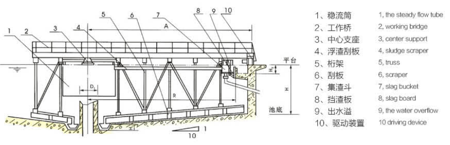 ?概述:GZB 型周邊傳動刮吸泥機適用于市政、造紙、化工、冶金、石油等行業(yè)的18cm 以上的沉淀池或濃縮池的污泥清除,是水處理的理想機械設(shè)備,其工作原理為周邊驅(qū)動橋架繞中心支座帶動刮泥板旋轉(zhuǎn),將沉降池底的污泥刮到中心集泥坑排出,液面浮渣由刮泥板濃縮至集渣斗排出。